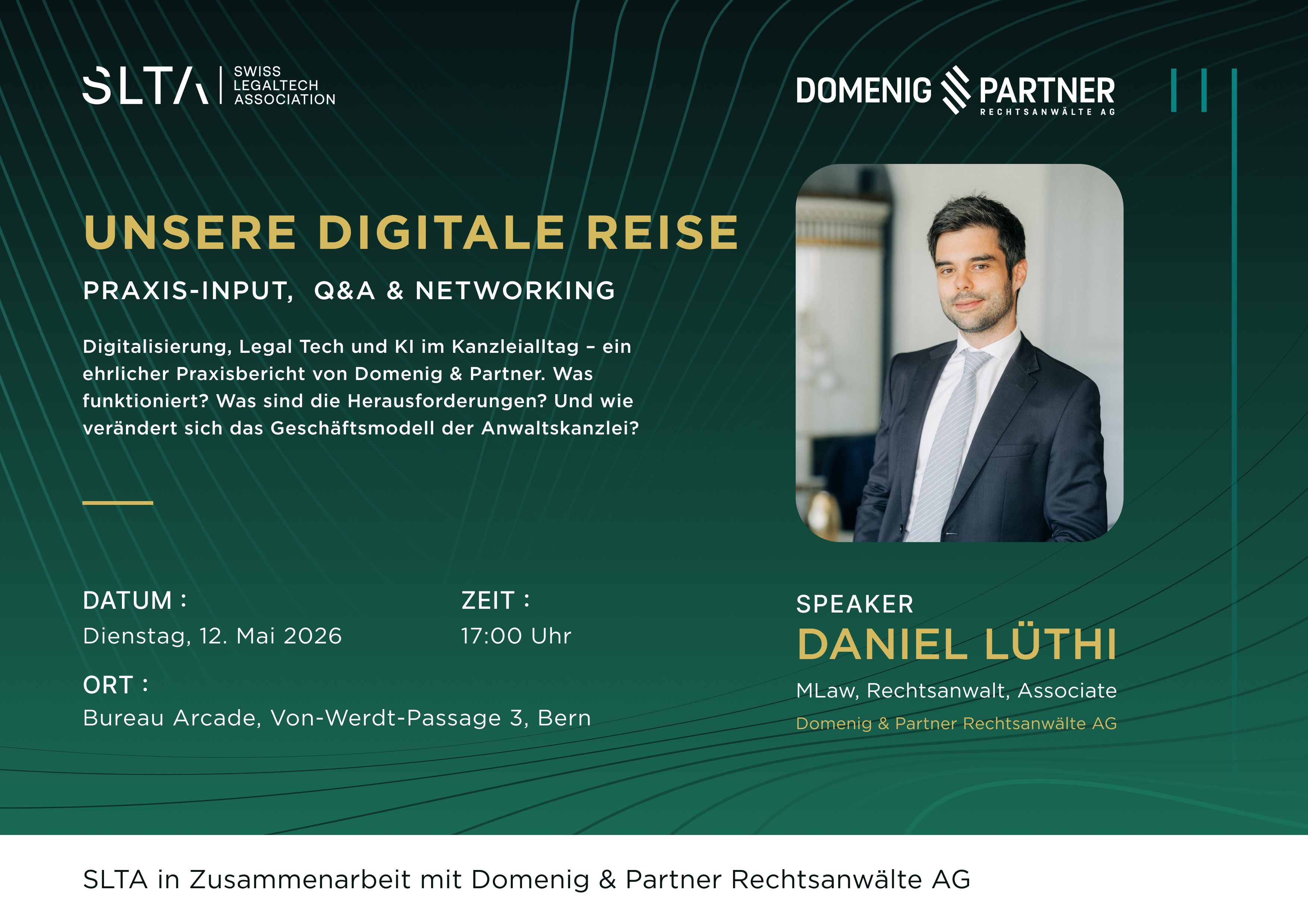 In diesem Praxisbericht gibt Daniel Lüthi von Domenig & Partner Rechtsanwälte AG Einblick in die digitale Entwicklung der Kanzlei und teilt konkrete Erfahrungen aus den letzten Jahren. Im Fokus stehen die strategische Herangehensweise an die Digitalisierung, die Zusammenarbeit mit Technologiepartnern sowie die Möglichkeit, Lösungen aktiv mitzugestalten.